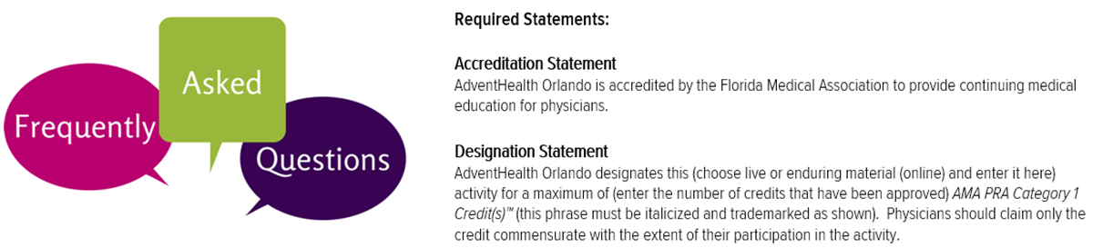 Marketing material created for your lecture that indicates any number of credits must include the Accreditation and Designation Statements shown below.  If the marketing material does not mention CME, the statements do not have to be added.